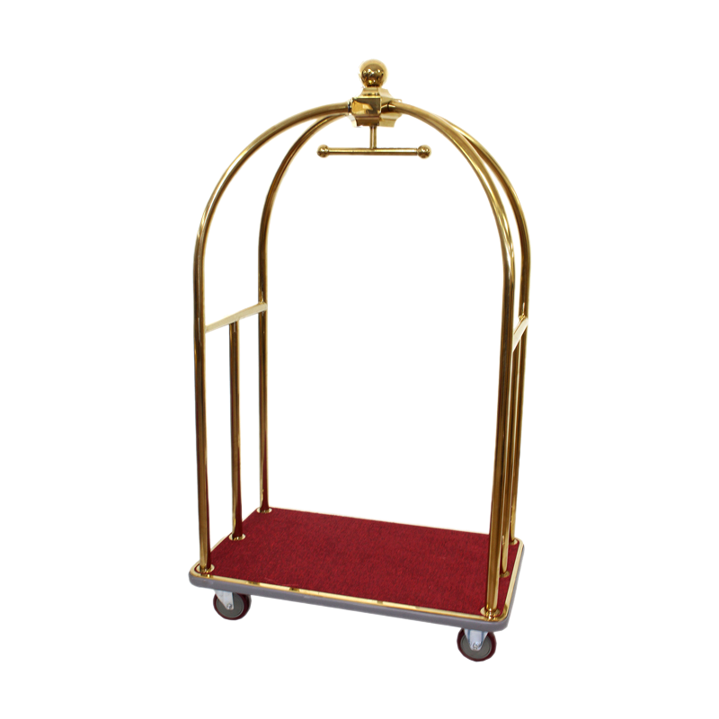 چرخ دستی حمل بار هتلی V.I.P، که با نام ترولی حمل چمدان نیز شناخته میشود، یکی از تجهیزات ضروری در صنعت هتلداری و خدمات لوکس است. این مدل با فریم فلزی طلایی رنگ، پایه فرششده قرمز و طراحی کلاسیک، جلوهای شیک و حرفهای به فضای پذیرش هتل میبخشد.