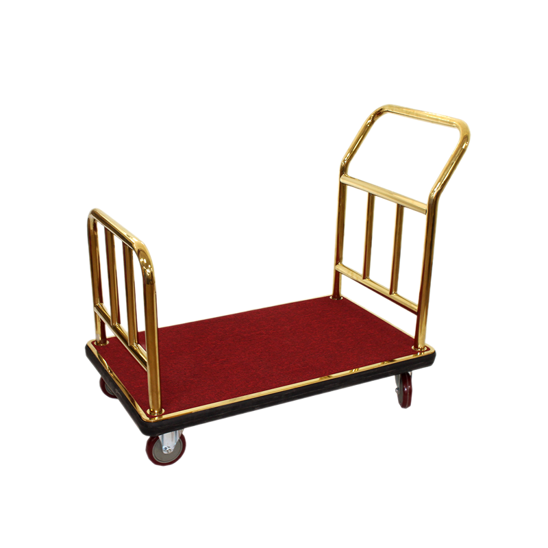 ترولی (چرخدستی) حمل چمدان هتلی لوکس با طراحی کلاسیک و رنگ طلایی، انتخابی ایدهآل برای هتلهای لوکس، مراکز اقامتی و فضاهای پذیرایی سطح بالا است. این محصول با ترکیب فلز مقاوم و پوشش فرش قرمز، جلوهای شیک و حرفهای به محیط میبخشد و تجربهای دلپذیر برای مهمانان فراهم میکند.